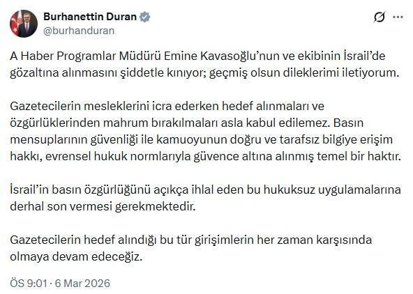 ANKARA,(DHA)- İLETİŞİM Başkanı Burhanettin Duran, "A Haber Programlar Müdürü Emine Kavasoğlu’nun ve ekibinin İsrail’de gözaltına alınmasını şiddetle kınıyor; geçmiş olsun dileklerimi iletiyorum” dedi.
