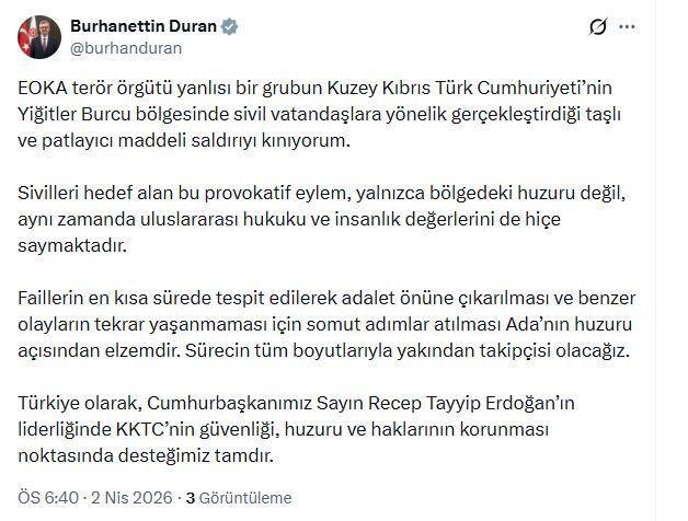 ANKARA, (DHA)- İLETİŞİM Başkanı Burhanettin Duran, “EOKA terör örgütü yanlısı bir grubun Kuzey Kıbrıs Türk Cumhuriyeti’nin Yiğitler Burcu bölgesinde sivil vatandaşlara yönelik gerçekleştirdiği taşlı ve patlayıcı maddeli saldırıyı kınıyorum” dedi.