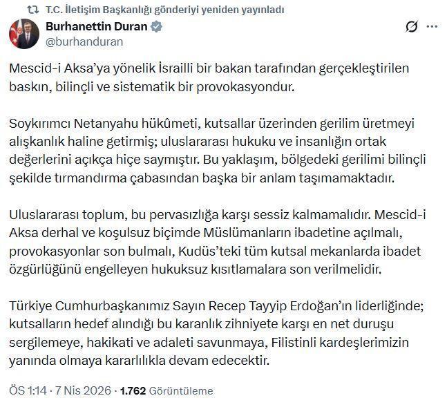 ANKARA, (DHA)- İLETİŞİM Başkanı Burhanettin Duran, "Mescid-i Aksa’ya yönelik İsrailli bir bakan tarafından gerçekleştirilen baskın, bilinçli ve sistematik bir provokasyondur" dedi.