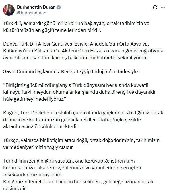 İletişim Başkanı Duran, 'Dünya Türk Dili Ailesi Günü' dolayısıyla sosyal medya hesabından açıklama yaptı. Duran, "Türk dili, asırlardır gönülleri birbirine bağlayan; ortak tarihimizin ve kültürümüzün en güçlü temellerinden biridir. Dünya Türk Dili Ailesi Günü vesilesiyle; Anadolu’dan Orta Asya’ya, Kafkasya’dan Balkanlar’a, Akdeniz’den Hazar’a uzanan geniş coğrafyada aynı dili konuşan tüm kardeş halklarını muhabbetle selamlıyorum. Sayın Cumhurbaşkanımız Recep Tayyip Erdoğan’ın ifadesiyle: 'Birliğimiz gücümüzdür şiarıyla Türk dünyasını her alanda kuvvetli kılmayı, farklı meydan okumalar karşısında daha dirençli ve dayanıklı hale getirmeyi hedefliyoruz.' Bugün, Türk Devletleri Teşkilatı çatısı altında güçlenen iş birliğimiz, ortak dilimizin ve kültürümüzün gelecek nesillere daha güçlü şekilde aktarılmasına öncülük etmektedir. Türkçe, yalnızca bir iletişim aracı değil; ortak değerlerimizin, tarihimizin ve medeniyetimizin taşıyıcısıdır. Türk dilinin zenginliğini yaşatan, onu koruyup geliştiren tüm kurumlarımıza, akademisyenlerimize ve gönül erlerine en içten teşekkürlerimi sunuyorum. Birliğimizin temeli olan dilimizin her kelimesi, geleceğe uzanan ortak sesimizdir” dedi. (DHA)