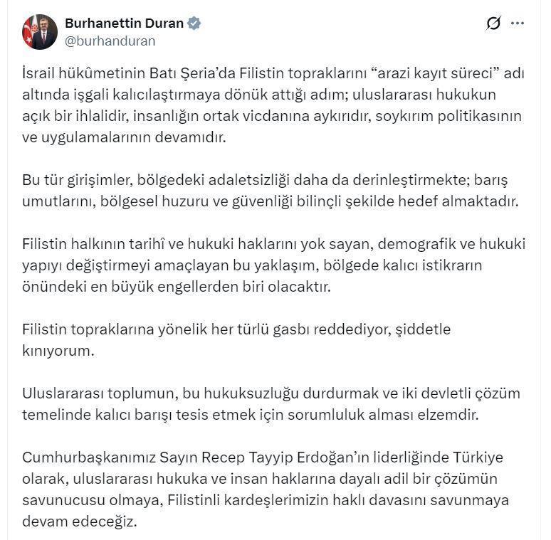 ANKARA, (DHA)- İLETİŞİM Başkanı Burhanettin Duran, "İsrail hükümetinin Batı Şeria'da Filistin topraklarını 'arazi kayıt süreci' adı altında işgali kalıcılaştırmaya dönük attığı adım; uluslararası hukukun açık bir ihlalidir, insanlığın ortak vicdanına aykırıdır, soykırım politikasının ve uygulamalarının devamıdır" dedi.