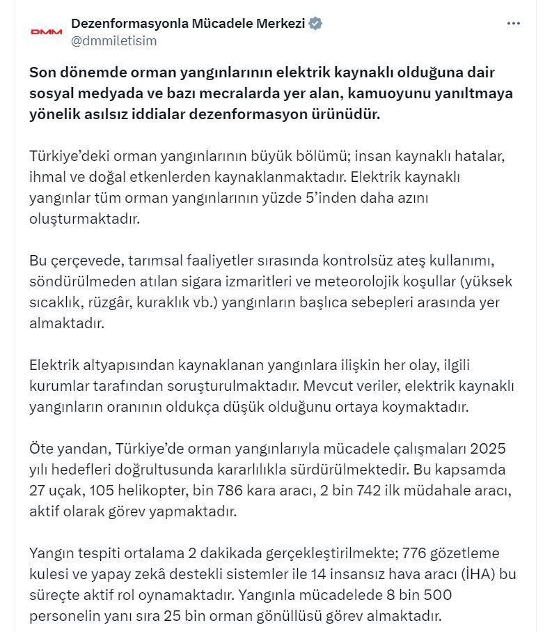 DMM'nin sosyal medya hesabından yapılan açıklamada, "Son dönemde orman yangınlarının elektrik kaynaklı olduğuna dair sosyal medyada ve bazı mecralarda yer alan, kamuoyunu yanıltmaya yönelik asılsız iddialar dezenformasyon ürünüdür. Türkiye'deki orman yangınlarının büyük bölümü; insan kaynaklı hatalar, ihmal ve doğal etkenlerden kaynaklanmaktadır. Elektrik kaynaklı yangınlar tüm orman yangınlarının yüzde 5'inden daha azını oluşturmaktadır. Bu çerçevede, tarımsal faaliyetler sırasında kontrolsüz ateş kullanımı, söndürülmeden atılan sigara izmaritleri ve meteorolojik koşullar (yüksek sıcaklık, rüzgar, kuraklık vb.) yangınların başlıca sebepleri arasında yer almaktadır" denildi.