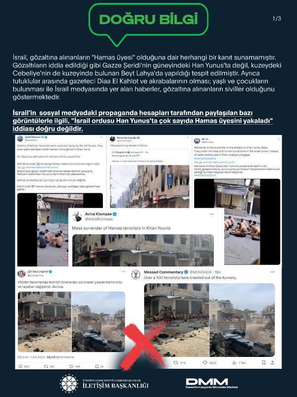 Kaan ULU/ANKARA, (DHA)- İLETİŞİM Başkanlığı Dezenformasyonla Mücadele Merkezi'nce, "'İsrail ordusu Han Yunus'ta çok sayıda Hamas üyesini yakaladı' iddiası doğru değildir" açıklaması yapıldı.