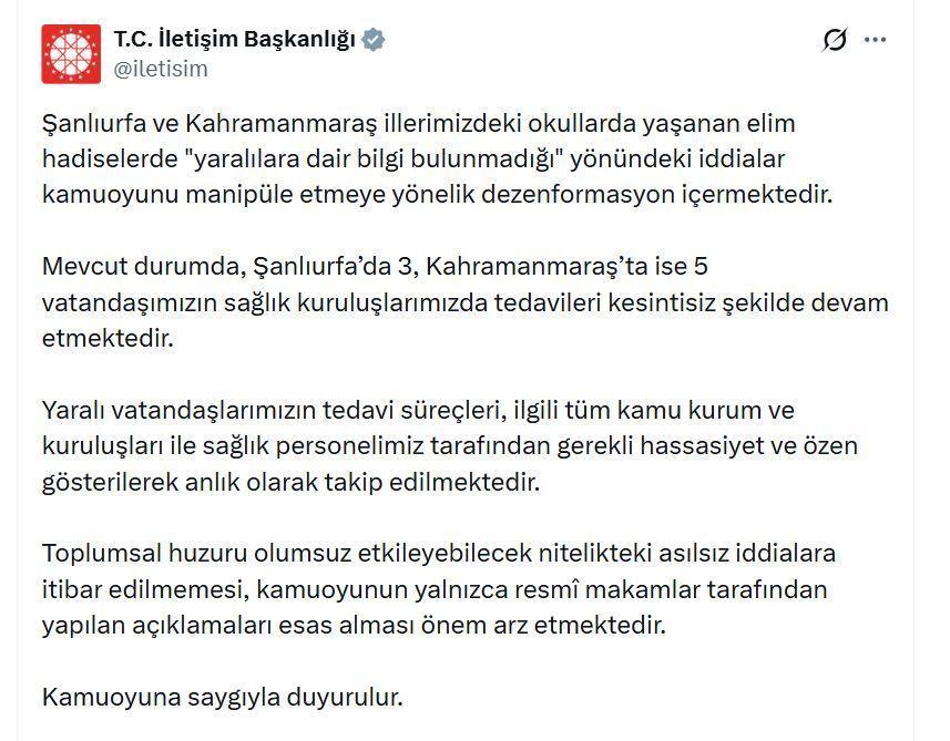 Başkanlığın sanal medya hesabından yapılan açıklamada, "Şanlıurfa ve Kahramanmaraş illerimizdeki okullarda yaşanan elim hadiselerde 'yaralılara dair bilgi bulunmadığı' yönündeki iddialar kamuoyunu manipüle etmeye yönelik dezenformasyon içermektedir. Mevcut durumda, Şanlıurfa'da 3, Kahramanmaraş'ta ise 5 vatandaşımızın sağlık kuruluşlarımızda tedavileri kesintisiz şekilde devam etmektedir. Yaralı vatandaşlarımızın tedavi süreçleri, ilgili tüm kamu kurum ve kuruluşları ile sağlık personelimiz tarafından gerekli hassasiyet ve özen gösterilerek anlık olarak takip edilmektedir. Toplumsal huzuru olumsuz etkileyebilecek nitelikteki asılsız iddialara itibar edilmemesi, kamuoyunun yalnızca resmi makamlar tarafından yapılan açıklamaları esas alması önem arz etmektedir" denildi. (DHA)