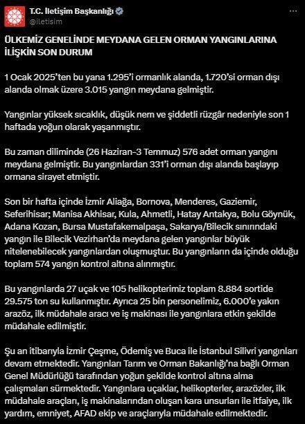 İletişim Başkanlığı'nın sosyal medya hesabından yapılan açıklamada, "1 Ocak 2025’ten bu yana 1295’i ormanlık alanda, 1720’si orman dışı alanda olmak üzere 3 bin 15 yangın meydana gelmiştir. Yangınlar yüksek sıcaklık, düşük nem ve şiddetli rüzgar nedeniyle son 1 haftada yoğun olarak yaşanmıştır. Bu zaman diliminde (26 Haziran-3 Temmuz) 576 adet orman yangını meydana gelmiştir. Bu yangınlardan 331’i orman dışı alanda başlayıp ormana sirayet etmiştir. Son bir hafta içinde İzmir Aliağa, Bornova, Menderes, Gaziemir, Seferihisar; Manisa Akhisar, Kula, Ahmetli, Hatay Antakya, Bolu Göynük, Adana Kozan, Bursa Mustafakemalpaşa, Sakarya/Bilecik sınırındaki yangın ile Bilecik Vezirhan’da meydana gelen yangınlar büyük nitelenebilecek yangınlardan oluşmuştur" denildi.