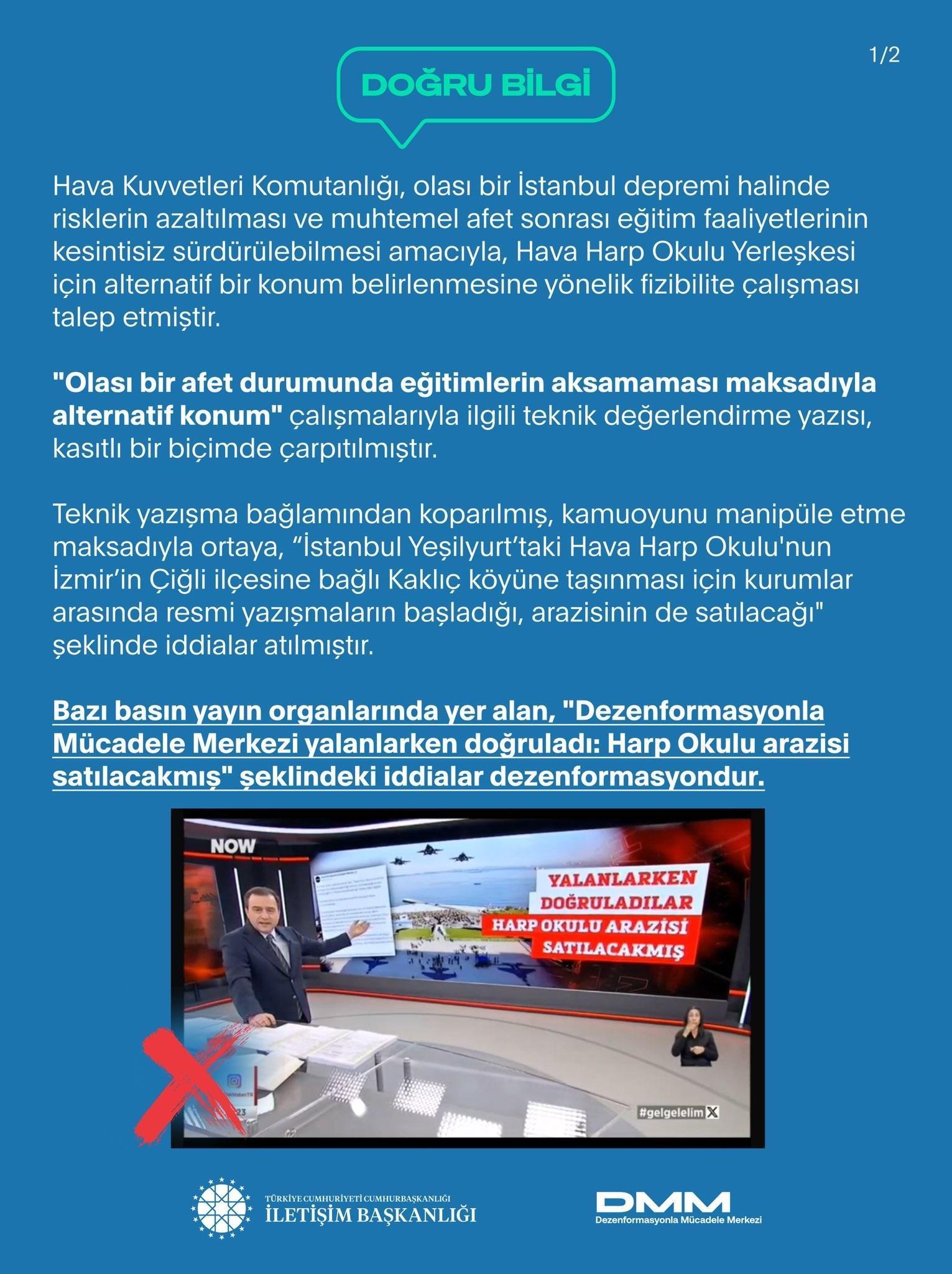 DMM’nin sosyal medya hesabından yapılan paylaşımda, “Bazı basın yayın organlarında yer alan, ‘Dezenformasyonla Mücadele Merkezi yalanlarken doğruladı: Harp Okulu arazisi satılacakmış’ şeklindeki iddialar dezenformasyondur. Hava Kuvvetleri Komutanlığı, olası bir İstanbul depremi halinde risklerin azaltılması ve muhtemel afet sonrası eğitim faaliyetlerinin kesintisiz sürdürülebilmesi amacıyla, Hava Harp Okulu Yerleşkesi için alternatif bir konum belirlenmesine yönelik fizibilite çalışması talep etmiştir. ‘Olası bir afet durumunda eğitimlerin aksamaması maksadıyla alternatif konum’ çalışmalarıyla ilgili teknik değerlendirme yazısı, kasıtlı bir biçimde çarpıtılmıştır. Teknik yazışma bağlamından koparılmış, kamuoyunu manipüle etme maksadıyla ortaya, ‘İstanbul Yeşilyurt’taki Hava Harp Okulu'nun İzmir’in Çiğli ilçesine bağlı Kaklıç köyüne taşınması için kurumlar arasında resmi yazışmaların başladığı, arazisinin de satılacağı’ şeklinde iddialar atılmıştır. Bahse konu iddialar Merkezimiz tarafından yalanlanmış, teknik bir yazışmanın bağlamından koparıldığı açıkça ifade edilmiştir. Merkezimizin iddialara ilişkin açıklamasında, ‘Hava Harp Okulu’nun taşınmasına yönelik alınmış bir karar bulunmadığı’ vurgulanmıştır. Hava Harp Okulu Yerleşkesinde deprem riski de göz önünde bulundurularak başlatılan güçlendirme ve iskan amaçlı kapasite artırım çalışmalarının devam ettiği belirtilmiştir. Bu açıklamanın da teknik yazışmalar gibi çarpıtılıp servis edildiği tespit edilmiştir. Hava Harp Okulu’nun taşınmasına, dolayısıyla arazinin boşaltılıp satılmasına yönelik bir karar veya çalışma bulunmamaktadır” denildi. (DHA)