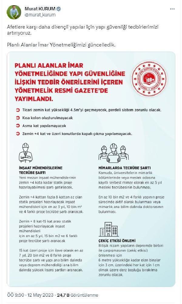 Resmi Gazete'de, 'Planlı Alanlar İmar Yönetmeliği'nde değişiklik yapılmasına dair yönetmelik yayımlandı. Bakan Murat Kurum, yönetmelik değişikliğine ilişkin Twitter hesabından yaptığı açıklamada, "Afetlere karşı daha dirençli yapılar için yapı güvenliği tedbirlerimizi artırıyoruz. 'Planlı Alanlar İmar Yönetmeliğimiz'i güncelledik" dedi.