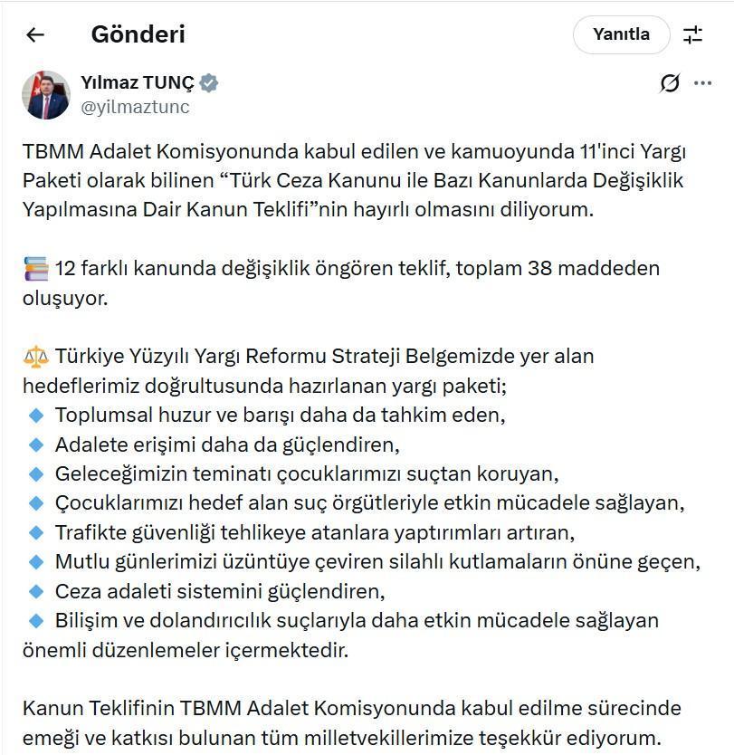 Adalet Bakanı Yılmaz Tunç, 11'inci Yargı Paketi olarak bilinen 'Türk Ceza Kanunu ile Bazı Kanunlarda Değişiklik Yapılmasına Dair Kanun Teklifi'nin TBMM Adalet Komisyonu'ndan geçmesine ilişkin sosyal medya hesabından açıklama yaptı. Bakan Tunç, "TBMM Adalet Komisyonunda kabul edilen ve kamuoyunda 11'inci Yargı Paketi olarak bilinen 'Türk Ceza Kanunu ile Bazı Kanunlarda Değişiklik Yapılmasına Dair Kanun Teklifi'nin hayırlı olmasını diliyorum. 12 farklı kanunda değişiklik öngören teklif, toplam 38 maddeden oluşuyor. Türkiye Yüzyılı Yargı Reformu Strateji Belgemizde yer alan hedeflerimiz doğrultusunda hazırlanan yargı paketi; toplumsal huzur ve barışı daha da tahkim eden, adalete erişimi daha da güçlendiren, geleceğimizin teminatı çocuklarımızı suçtan koruyan, çocuklarımızı hedef alan suç örgütleriyle etkin mücadele sağlayan, trafikte güvenliği tehlikeye atanlara yaptırımları artıran, mutlu günlerimizi üzüntüye çeviren silahlı kutlamaların önüne geçen, ceza adaleti sistemini güçlendiren, bilişim ve dolandırıcılık suçlarıyla daha etkin mücadele sağlayan önemli düzenlemeler içermektedir. Kanun teklifinin TBMM Adalet Komisyonunda kabul edilme sürecinde emeği ve katkısı bulunan tüm milletvekillerimize teşekkür ediyorum" ifadelerini kullandı. (DHA)