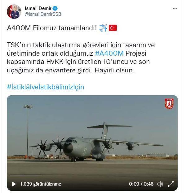ANKARA, (DHA)- CUMHURBAŞKANLIĞI Savunma Sanayii Başkanı İsmail Demir, Türkiye'nin proje ortakları arasında yer aldığı A400M programı kapsamında 10'uncu ve son uçağında envantere girdiğini belirterek, "A400M Filomuz tamamlandı" dedi.