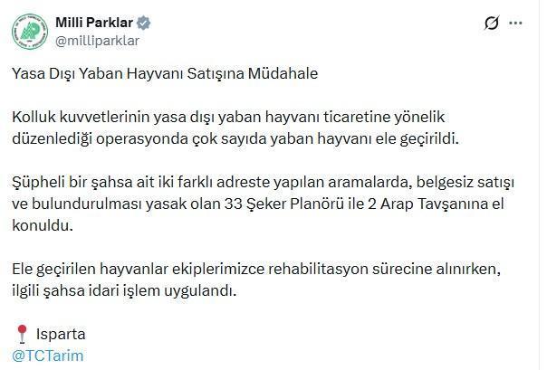 Doğa Koruma ve Milli Parklar Genel Müdürlüğü’nün (DKMP) sanal medya hesabından yapılan açıklamada, "Kolluk kuvvetlerinin yasa dışı yaban hayvanı ticaretine yönelik düzenlediği operasyonda çok sayıda yaban hayvanı ele geçirildi. Şüpheli bir şahsa ait iki farklı adreste yapılan aramalarda, belgesiz satışı ve bulundurulması yasak olan 33 şeker planörü ile 2 Arap tavşanına el konuldu. Ele geçirilen hayvanlar ekiplerimizce rehabilitasyon sürecine alınırken, ilgili şahsa idari işlem uygulandı” denildi. (DHA)