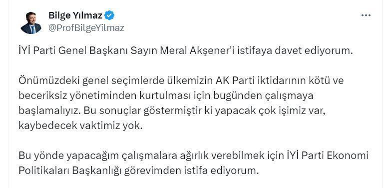 ANKARA, (DHA)- İYİ Parti Ekonomi Politikaları Başkanı Bilge Yılmaz, Genel Başkan Meral Akşener'i istifaya davet ederek, partisindeki görevinden ayrıldığını duyurdu.