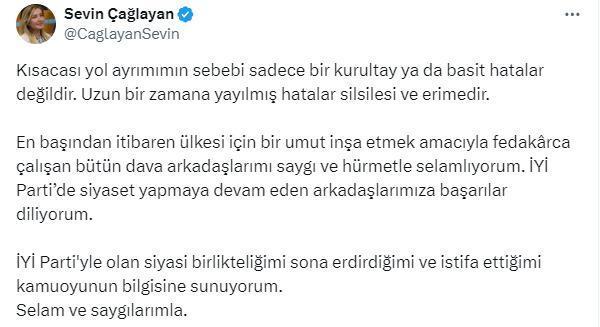Sevin Çağlayan, sosyal medya hesabından yaptığı açıklamada, 2023 genel seçim süreci, 2024 yerel seçimleri ve akabinde yapılan İYİ Parti 5'inci Olağanüstü Kurultayı'nın ardından ortaya çıkan partinin yeni yapılanmasının pek çok hata ve telafi edilemez sorunlar barındırdığını ifade etti. Çağlayan, "Bununla beraber genel ve yerel seçim süreçlerinde, ardından da yeni yapılanma sırasında ortaya atılan iddialar canımızı yakarken, bunlara cevap vermesi gerekenlerin sessizliği ve gereken tepkileri vermemeleri artık beni de yol ayrımına getirdi. Bardağı taşıran son damla da İYİ Parti Kurucu Genel Başkanı Sayın Meral Akşener’in Cumhurbaşkanı Sayın Recep Tayyip Erdoğan ile Saray'da yaptığı, birçok iddiayı içinde barındıran ancak sebebi ve içeriği bir türlü açıklanmayan görüşmesi oldu. Bu görüşmeye mevcut parti yönetimi de net bir tavır koymadı" ifadelerini kullandı.