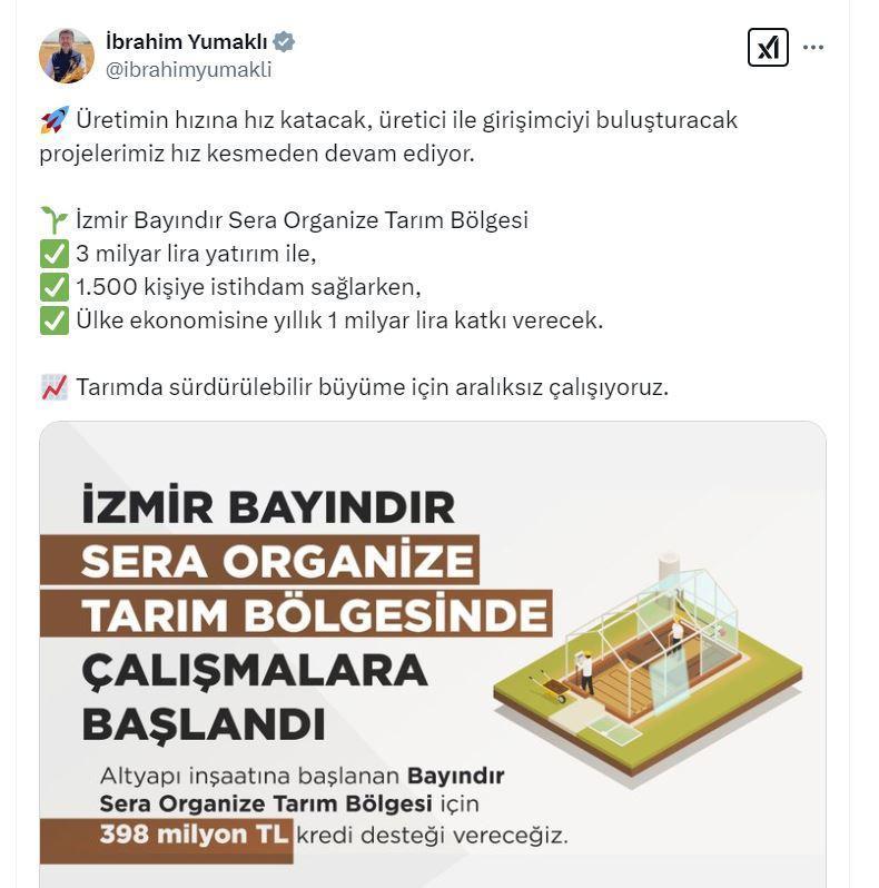 Gizem CENGİL/ANKARA, (DHA)- TARIM ve Orman Bakanı İbrahim Yumaklı, altyapı inşaatına başlanan İzmir Bayındır Sera Organize Tarım Bölgesi için 398 milyon TL kredi desteği vereceklerini duyurdu.