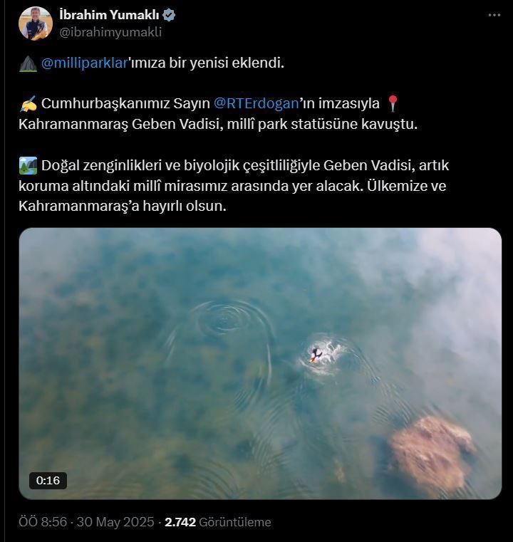ANKARA, (DHA)- TARIM ve Orman Bakanı İbrahim Yumaklı, Kahramanmaraş Geben Vadisi'nin milli park statüsüne alındığını açıkladı.