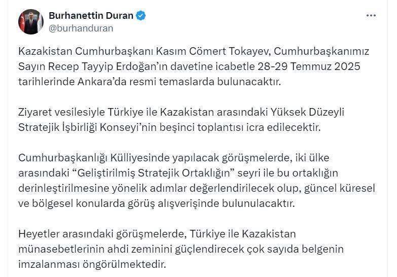 İletişim Başkanı Duran, sosyal medya hesabından yaptığı açıklamada, "Kazakistan Cumhurbaşkanı Kasım Cömert Tokayev, Cumhurbaşkanımız Sayın Recep Tayyip Erdoğan'ın davetine icabetle 28-29 Temmuz 2025 tarihlerinde Ankara'da resmi temaslarda bulunacaktır. Ziyaret vesilesiyle Türkiye ile Kazakistan arasındaki Yüksek Düzeyli Stratejik İşbirliği Konseyi'nin beşinci toplantısı icra edilecektir. Cumhurbaşkanlığı Külliyesi'nde yapılacak görüşmelerde, iki ülke arasındaki 'Geliştirilmiş Stratejik Ortaklığın' seyri ile bu ortaklığın derinleştirilmesine yönelik adımlar değerlendirilecek olup, güncel küresel ve bölgesel konularda görüş alışverişinde bulunulacaktır. Heyetler arasındaki görüşmelerde, Türkiye ile Kazakistan münasebetlerinin ahdi zeminini güçlendirecek çok sayıda belgenin imzalanması öngörülmektedir" ifadelerini kullandı. (DHA)