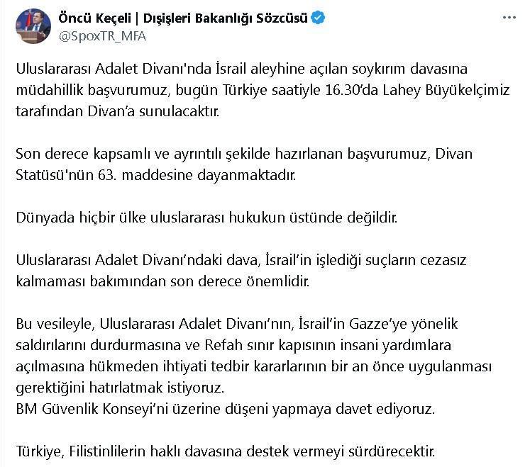 ANKARA, (DHA)- DIŞİŞLERİ Bakanlığı Sözcüsü Öncü Keçeli, "Uluslararası Adalet Divanı'nda İsrail aleyhine açılan soykırım davasına müdahillik başvurumuz, bugün Türkiye saatiyle 16.30'da Lahey Büyükelçimiz tarafından Divan'a sunulacaktır" dedi.