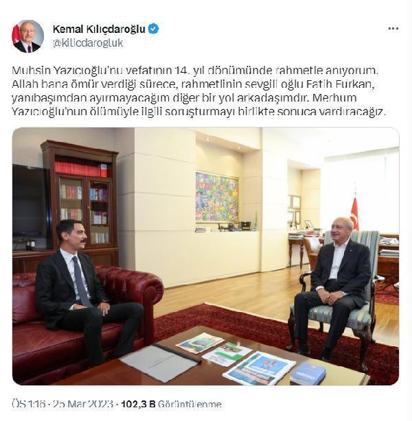 CHP Lideri Kemal Kılıçdaroğlu, Twitter'daki hesabından yaptığı açıklamada, "Muhsin Yazıcıoğlu'nu vefatının 14'üncü yıl dönümünde rahmetle anıyorum. Allah bana ömür verdiği sürece, rahmetlinin sevgili oğlu Fatih Furkan, yanı başımdan ayırmayacağım diğer bir yol arkadaşımdır. Merhum Yazıcıoğlu'nun ölümüyle ilgili soruşturmayı birlikte sonuca vardıracağız" dedi. (DHA)