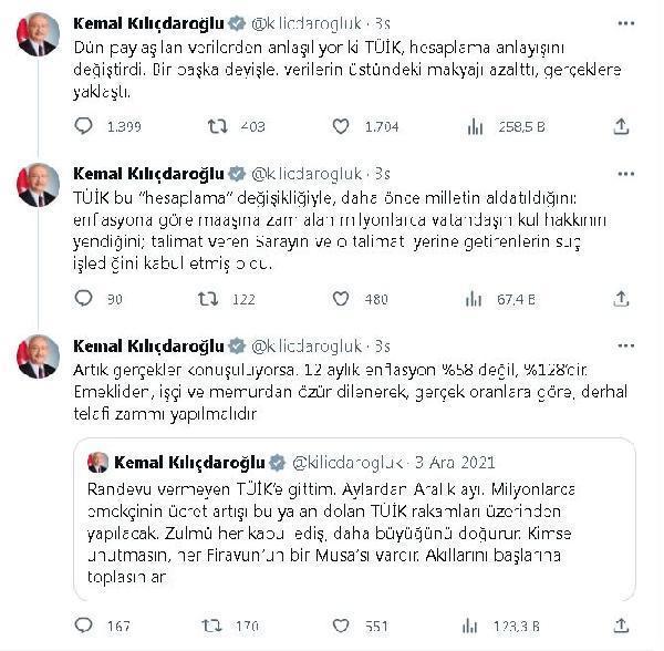 CHP lideri Kılıçdaroğlu, sosyal medya hesabından yaptığı paylaşımda, TÜİK'in açıkladığı enflasyon oranlarını değerlendirdi. Kılıçdaroğlu, "Dün paylaşılan verilerden anlaşılıyor ki TÜİK, hesaplama anlayışını değiştirdi. Bir başka deyişle, verilerin üstündeki makyajı azalttı, gerçeklere yaklaştı. TÜİK bu hesaplama değişikliğiyle, daha önce milletin aldatıldığını, enflasyona göre maaşına zam alan milyonlarca vatandaşın kul hakkının yendiğini, talimat veren sarayın ve o talimatı yerine getirenlerin suç işlediğini kabul etmiş oldu. Artık gerçekler konuşuluyorsa; 12 aylık enflasyon yüzde 58 değil, yüzde 128'dir. Emekliden, işçi ve memurdan özür dilenerek, gerçek oranlara göre, derhal telafi zammı yapılmalıdır" dedi. (DHA)