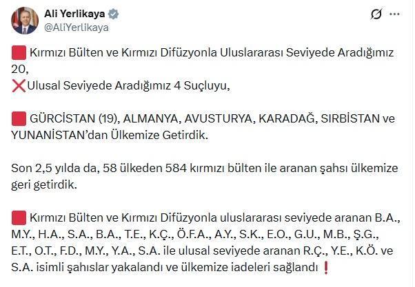 Bakan Yerlikaya, sosyal medya hesabından yaptığı açıklamada, "Kırmızı bülten ve kırmızı difüzyonla uluslararası seviyede aranan B.A., M.Y., H.A., S.A., B.A., T.E., K.Ç., Ö.F.A., A.Y., S.K., E.O., G.U., M.B., Ş.G., E.T., O.T., F.D., M.Y., Y.A., S.A. ile ulusal seviyede aranan R.Ç., Y.E., K.Ö. ve S.A. yakalandı ve ülkemize iadeleri sağlandı" dedi. Son 2,5 yılda, 58 ülkeden 584 kırmızı bülten ile aranan şüphelinin Türkiye'ye geri getirildiğini vurgulayan Bakan Yerlikaya, şunları kaydetti:
