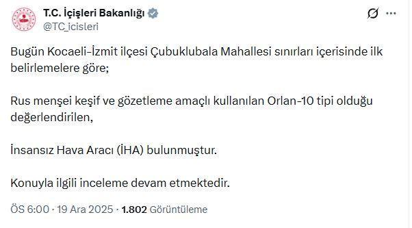 İçişleri Bakanlığı, Kocaeli'nin İzmit ilçesinde kırsal alana düşen İHA ile ilgili açıklama yaptı. Bakanlığın sosyal medya hesabından yapılan açıklamada, "Bugün Kocaeli-İzmit ilçesi Çubuklubala Mahallesi sınırları içerisinde ilk belirlemelere göre; Rus menşei keşif ve gözetleme amaçlı kullanılan Orlan-10 tipi olduğu değerlendirilen, İHA bulunmuştur. Konuyla ilgili inceleme devam etmektedir" denildi. (DHA)