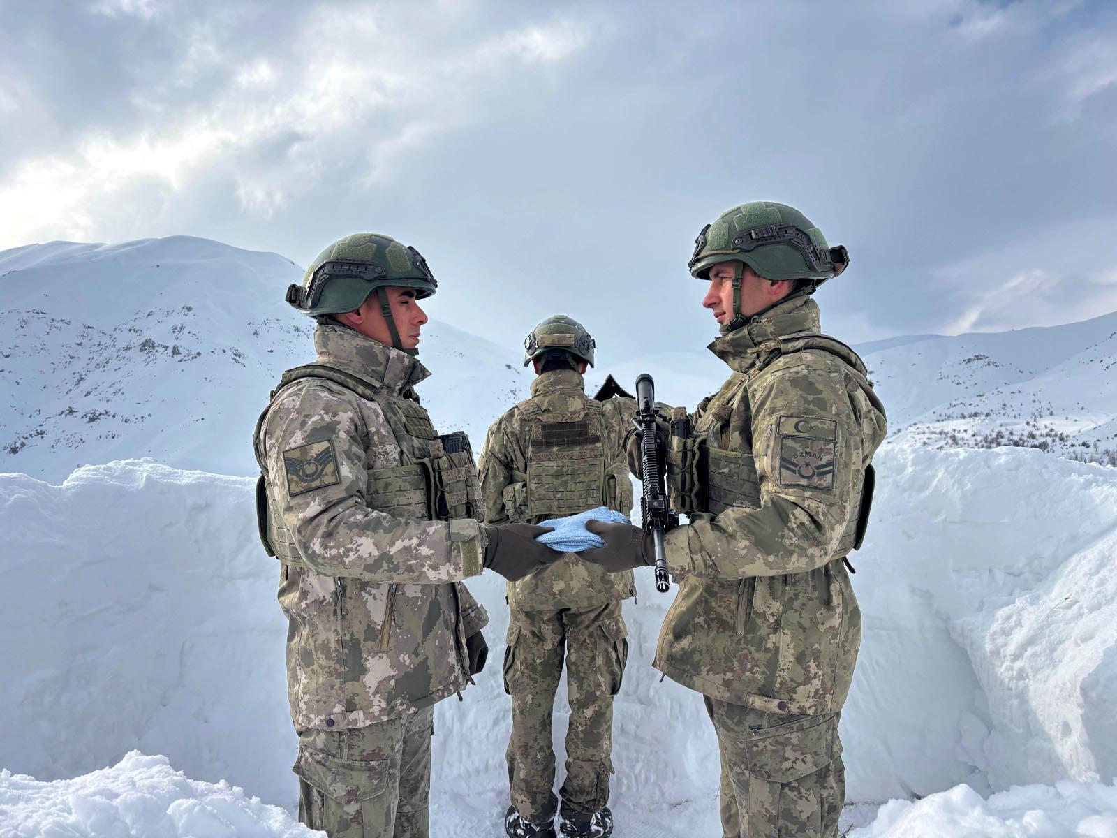 Milli Savunma Bakanlığı'nın sanal medya hesabından yapılan paylaşımda, "İstanbul’da ikamet eden Fatma Gül Hanım’ın gönülden örmüş olduğu 20 adet çorap, Dağ ve Komando Tugay Komutanlığımıza gönderilerek Mehmetçiklerimize teslim edildi" denildi. Paylaşımda, çoraplar zorlu kış koşullarında görev yapan komandolara teslim edilirken çekilen fotoğraflar yer aldı. (DHA)