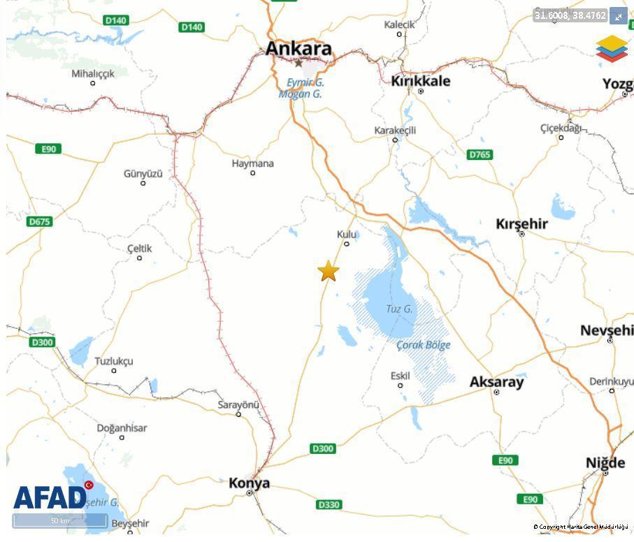 AFET ve Acil Durum Yönetimi Başkanlığı’nın (AFAD) açıkladığı verilere göre; merkez üssü Konya'nın Kulu ilçesi olan deprem saat 14.44'te meydana geldi. Yerin 11,62 kilometre derinliğindeki deprem, merkez üssüne yakın yerleşim yerlerinde hissedildi. (DHA)