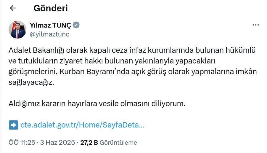 Adalet Bakanı Yılmaz Tunç, sosyal medya hesabından açıklama yaptı. Bakan Tunç, "Adalet Bakanlığı olarak kapalı ceza infaz kurumlarında bulunan hükümlü ve tutukluların ziyaret hakkı bulunan yakınlarıyla yapacakları görüşmelerini, Kurban Bayramı'nda açık görüş olarak yapmalarına imkan sağlayacağız" dedi. (DHA)