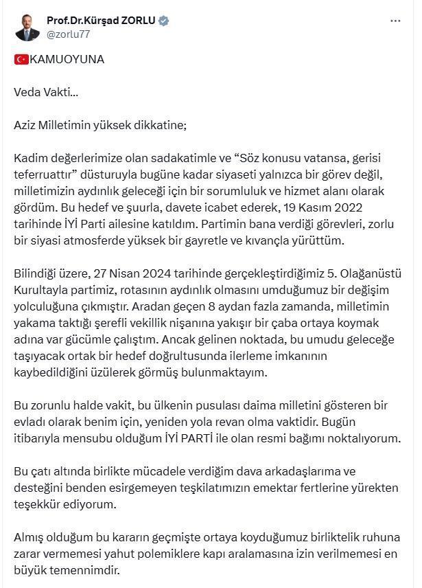 Eski parti sözcüsü Ankara Milletvekili Kürşat Zorlu, sosyal medya hesabından 'Veda vakti', 'Aziz milletimin yüksek dikkatine' notuyla açıklama yaptı. Zorlu, "Kadim değerlerimize olan sadakatimle ve 'Söz konusu vatansa, gerisi teferruattır' düsturuyla bugüne kadar siyaseti yalnızca bir görev değil, milletimizin aydınlık geleceği için bir sorumluluk ve hizmet alanı olarak gördüm. Bu hedef ve şuurla, davete icabet ederek, 19 Kasım 2022 tarihinde İYİ Parti ailesine katıldım. Partimin bana verdiği görevleri, zorlu bir siyasi atmosferde yüksek bir gayretle ve kıvançla yürüttüm. Bilindiği üzere, 27 Nisan 2024 tarihinde gerçekleştirdiğimiz 5'inci olağanüstü kurultayla partimiz, rotasının aydınlık olmasını umduğumuz bir değişim yolculuğuna çıkmıştır. Aradan geçen 8 aydan fazla zamanda, milletimin yakama taktığı şerefli vekillik nişanına yakışır bir çaba ortaya koymak adına var gücümle çalıştım. Ancak gelinen noktada, bu umudu geleceğe taşıyacak ortak bir hedef doğrultusunda ilerleme imkanının kaybedildiğini üzülerek görmüş bulunmaktayım. Bu zorunlu halde vakit, bu ülkenin pusulası daima milletini gösteren bir evladı olarak benim için, yeniden yola revan olma vaktidir. Bugün itibarıyla mensubu olduğum İYİ Parti ile olan resmi bağımı noktalıyorum. Bu çatı altında birlikte mücadele verdiğim dava arkadaşlarıma ve desteğini benden esirgemeyen teşkilatımızın emektar fertlerine yürekten teşekkür ediyorum. Almış olduğum bu kararın geçmişte ortaya koyduğumuz birliktelik ruhuna zarar vermemesi yahut polemiklere kapı aralamasına izin verilmemesi en büyük temennimdir. Bugüne kadar olduğu gibi bundan sonra da ülkeme hizmet için azim ve kararlılıkla çalışmaya devam edeceğim" ifadelerini kullandı. (DHA)