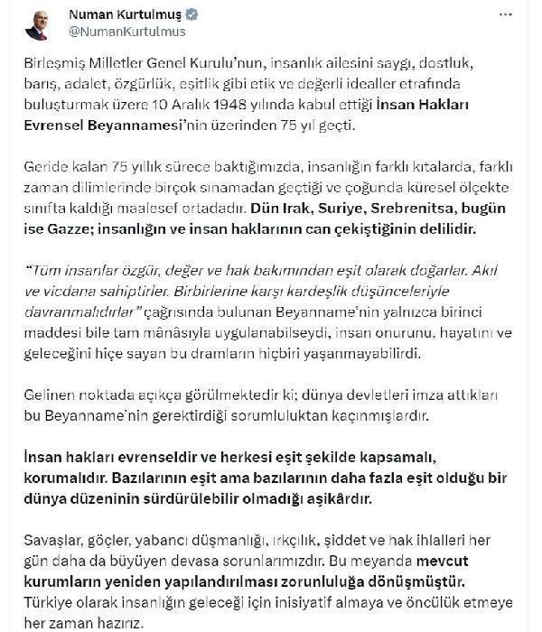 Kurtulmuş: Dünya İnsan Hakları Günü'nün tüm dünya için bir çıkış kapısı olmasını diliyorum