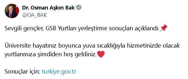 Mikail KARAMAN/ANKARA, (DHA)- GENÇLİK ve Spor Bakanı Osman Aşkın Bak, üniversitelerin örgün eğitim programlarına ilk kez kayıt yaptıran öğrenciler ile ara sınıf öğrenciler için Kredi ve Yurtlar Kurumu (KYK) yurt başvuru sonuçlarının açıklandığını duyurdu.