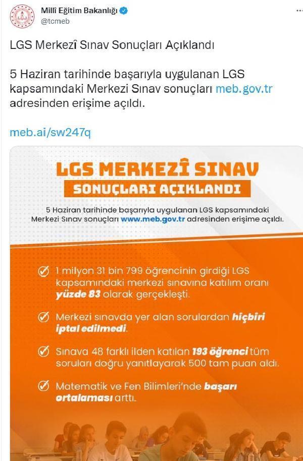 ANKARA, (DHA)- LİSELERE Geçiş Sistemi (LGS) sınav sonuçları açıklandı. Sınava 48 farklı ilden katılan 193 öğrenci tüm soruları doğru yanıtlayarak 500 tam puan aldı.