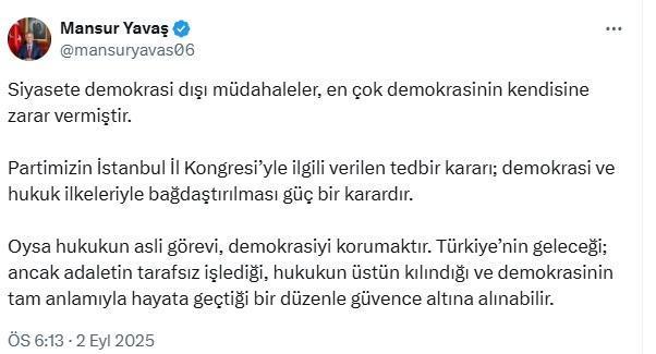 ABB Başkanı Yavaş, sosyal medya hesabı üzerinden CHP İl Kongresi için verilen iptal kararıyla ilgili açıklama yaptı. Yavaş, “Siyasete demokrasi dışı müdahaleler, en çok demokrasinin kendisine zarar vermiştir. Partimizin İstanbul İl Kongresi’yle ilgili verilen tedbir kararı; demokrasi ve hukuk ilkeleriyle bağdaştırılması güç bir karardır. Oysa hukukun asli görevi, demokrasiyi korumaktır. Türkiye’nin geleceği; ancak adaletin tarafsız işlediği, hukukun üstün kılındığı ve demokrasinin tam anlamıyla hayata geçtiği bir düzenle güvence altına alınabilir” ifadelerine yer verdi. (DHA)