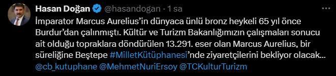 MS 2'nci ve 3'üncü yüzyıllara tarihlenen Marcus Aurelius heykeli, Burdur’un Gölhisar ilçesindeki Boubon Antik Kenti’nde 1960’lı yıllarda yapılan kaçak kazılar sonucu yurt dışına çıkarıldı. Eser, yıllar içinde el değiştirerek ABD’nin Ohio eyaletindeki Cleveland Sanat Müzesi koleksiyonuna girdi. Roma İmparatoru Marcus Aurelius’u bir filozof olarak tasvir etmesi nedeniyle antik sanat tarihinde özel bir yere sahip eser, Kültür ve Turizm Bakanlığı'nın yürüttüğü bilimsel çalışmalar sonucu 65 yıl sonra Türkiye'ye iade edildi. Türkiye'ye getirilen heykel Cumhurbaşkanlığı Külliyesi'ndeki Millet Kütüphanesi'nde ziyarete açıldı. Cumhurbaşkanlığı Özel Kalem Müdürü Hasan Doğan, sosyal medya hesabından yaptığı paylaşımda, "İmparator Marcus Aurelius’in dünyaca ünlü bronz heykeli 65 yıl önce Burdur’dan çalınmıştı. Kültür ve Turizm Bakanlığımızın çalışmaları sonucu ait olduğu topraklara döndürülen 13 bin 291'inci eser olan Marcus Aurelius, bir süreliğine Beştepe Millet Kütüphanesi’nde ziyaretçilerini bekliyor olacak" ifadelerini kullandı. (DHA)