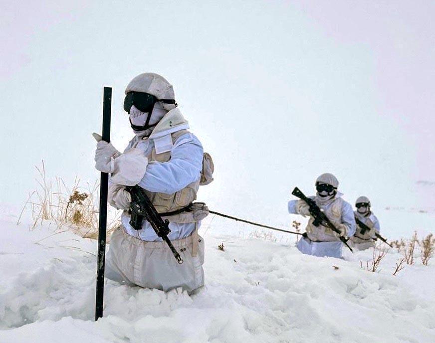 Bakanlığın sanal medya hesabından paylaşılan fotoğrafta bel bölgelerine kadar ulaşan karda devriye görevi yapan askerler yer aldı. Fotoğraf, 'Mehmetçik, en zorlu şartlarda görev başında' notuyla paylaşıldı. (DHA)