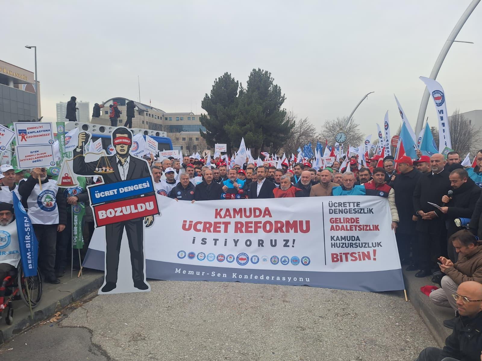 Umutcan ÖREN-Celal ATALAY/ANKARA, (DHA)- ANKARA'da Memur Sendikaları Konfederasyonu (Memur-Sen) üyesi kamu çalışanları, 'Kamuda ücret reformu' taleplerini dile getirmek üzere Hazine ve Maliye Bakanlığı önünde açıklama yaptı.