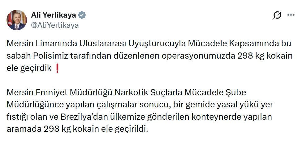 Umutcan ÖREN/ANKARA, (DHA)- İÇİŞLERİ Bakanı Ali Yerlikaya, Mersin Limanı'nda düzenlenen operasyonda 298 kilogram kokainin ele geçirdiğini açıkladı.