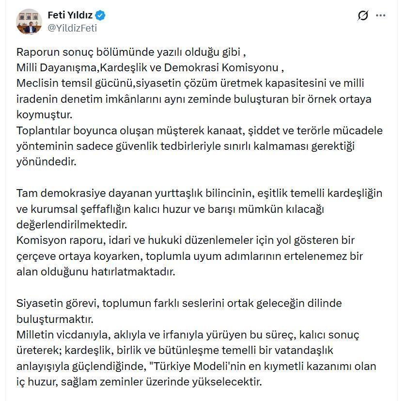 MHP'li Yıldız, sanal medya hesabından yaptığı açıklamada, "Raporun sonuç bölümünde yazılı olduğu gibi, Milli Dayanışma, Kardeşlik ve Demokrasi Komisyonu, Meclis'in temsil gücünü, siyasetin çözüm üretmek kapasitesini ve milli iradenin denetim imkanlarını aynı zeminde buluşturan bir örnek ortaya koymuştur. Toplantılar boyunca oluşan müşterek kanaat, şiddet ve terörle mücadele yönteminin sadece güvenlik tedbirleriyle sınırlı kalmaması gerektiği yönündedir. Tam demokrasiye dayanan yurttaşlık bilincinin, eşitlik temelli kardeşliğin ve kurumsal şeffaflığın kalıcı huzur ve barışı mümkün kılacağı değerlendirilmektedir. Komisyon raporu, idari ve hukuki düzenlemeler için yol gösteren bir çerçeve ortaya koyarken, toplumla uyum adımlarının ertelenemez bir alan olduğunu hatırlatmaktadır. Siyasetin görevi, toplumun farklı seslerini ortak geleceğin dilinde buluşturmaktır. Milletin vicdanıyla, aklıyla ve irfanıyla yürüyen bu süreç, kalıcı sonuç üreterek; kardeşlik, birlik ve bütünleşme temelli bir vatandaşlık anlayışıyla güçlendiğinde, 'Türkiye modeli'nin en kıymetli kazanımı olan iç huzur, sağlam zeminler üzerinde yükselecektir. Bir asır önce Mustafa Kemal Atatürk ve arkadaşlarının önderliğinde büyük zorlukları aşarak kardeşlik temelinde kurulan Cumhuriyetimiz, ikinci asrının başlangıcında toplumsal barış ve huzur iklimini tam manasıyla temin edecektir" ifadelerini kullandı.
