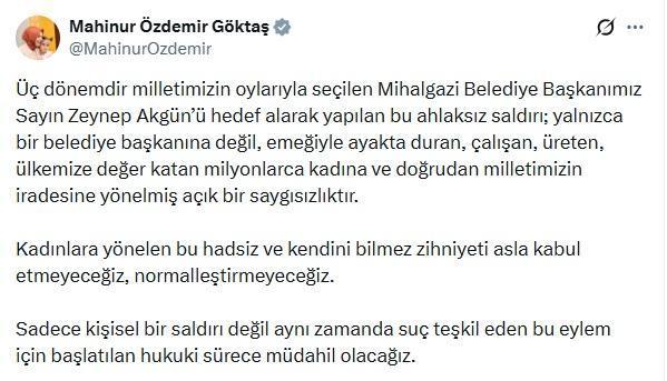 Aile ve Sosyal Hizmetler Bakanı Mahinur Özdemir Göktaş, konuyla ilgili sanal medya hesabından açıklama yaptı. Bakan Göktaş, "Üç dönemdir milletimizin oylarıyla seçilen Mihalgazi Belediye Başkanımız Sayın Zeynep Akgün’ü hedef alarak yapılan bu ahlaksız saldırı; yalnızca bir belediye başkanına değil, emeğiyle ayakta duran, çalışan, üreten, ülkemize değer katan milyonlarca kadına ve doğrudan milletimizin iradesine yönelmiş açık bir saygısızlıktır. Kadınlara yönelen bu hadsiz ve kendini bilmez zihniyeti asla kabul etmeyeceğiz, normalleştirmeyeceğiz. Sadece kişisel bir saldırı değil aynı zamanda suç teşkil eden bu eylem için başlatılan hukuki sürece müdahil olacağız" dedi. (DHA)