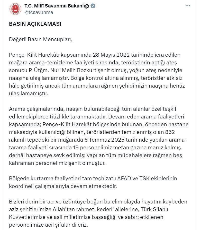 Bakanlığın sosyal medya hesabından yapılan açıklamada, "Pençe-Kilit Harekatı kapsamında 28 Mayıs 2022 tarihinde icra edilen mağara arama-temizleme faaliyeti sırasında, teröristlerin açtığı ateş sonucu Piyade Üsteğmen Nuri Melih Bozkurt şehit olmuş, yoğun ateş nedeniyle naaşına ulaşılamamıştır. Bölge kontrol altına alınmış, teröristler etkisiz hale getirilmiş ancak tüm aramalara rağmen şehidimizin naaşına henüz ulaşılamamıştır. Arama çalışmalarında, naaşın bulunabileceği tüm alanlar özel teşkil edilen ekiplerce titizlikle taranmaktadır. Devam eden arama faaliyetleri kapsamında; Pençe-Kilit Harekat bölgesinde bulunan, önceden hastane maksadıyla kullanıldığı bilinen, teröristlerden temizlenmiş olan 852 rakımlı tepedeki bir mağarada 6 Temmuz 2025 tarihinde yapılan arama-tarama faaliyeti sırasında 19 personelimiz metan gazına maruz kalmış, derhal hastaneye sevk edilmiş; yapılan tüm müdahalelere rağmen 5 kahraman personelimiz şehit olmuştur. Bölgede kurtarma faaliyetleri tam teçhizatlı AFAD ve TSK ekiplerinin koordineli çalışmalarıyla devam etmektedir. Bizleri derin bir acı ve üzüntüye boğan bu elim olayda hayatını kaybeden aziz şehitlerimize Allah'tan rahmet, kederli ailelerine, Türk Silahlı Kuvvetlerimize ve asil milletimize başsağlığı ve sabır; etkilenen personelimize acil şifalar dileriz" denildi. (DHA)