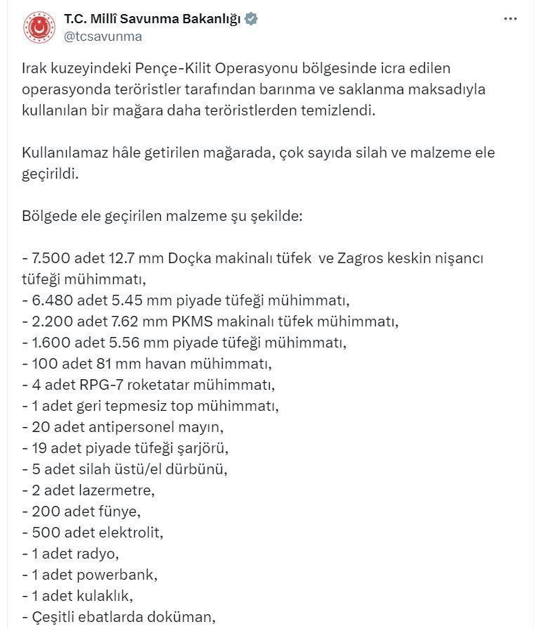 Bakanlığın sosyal medya hesabından yapılan açıklamada, "Irak kuzeyindeki Pençe-Kilit Operasyonu bölgesinde icra edilen operasyonda teröristler tarafından barınma ve saklanma maksadıyla kullanılan bir mağara daha teröristlerden temizlendi. Kullanılamaz hale getirilen mağarada, silah, mühimmat ve malzemeler ele geçirildi. Bölgede ele geçirilen malzemeler; 7 bin 500 12.7 mm Doçka makinalı tüfek ve Zagros keskin nişancı tüfeği mühimmatı, 6 bin 480 5.45 mm piyade tüfeği mühimmatı, 2 bin 200 7.62 mm PKMS makinalı tüfek mühimmatı, 1600 5.56 mm piyade tüfeği mühimmatı,100 adet 81 mm havan mühimmatı, 4 RPG-7 roketatar mühimmatı, 1 geri tepmesiz top mühimmatı, 20 antipersonel mayın, 19 piyade tüfeği şarjörü, 5 silah üstü/el dürbünü, 2 adet lazermetre, 200 fünye, 500 adet elektrolit, 1 radyo, 1 powerbank, 1 adet kulaklık, çeşitli ebatlarda doküman, çeşitli ebatlarda dürbün çantaları" denildi. (DHA)