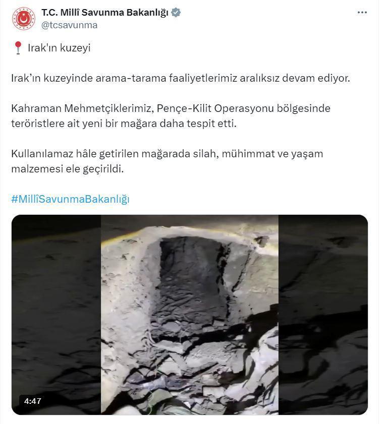 Ruken KADIOĞLU/ANKARA, (DHA)- MİLLİ Savunma Bakanlığı (MSB), Pençe-Kilit Operasyonu bölgesinde tespit edilen mağarada silah, mühimmat ve yaşam malzemesi ele geçirildi.