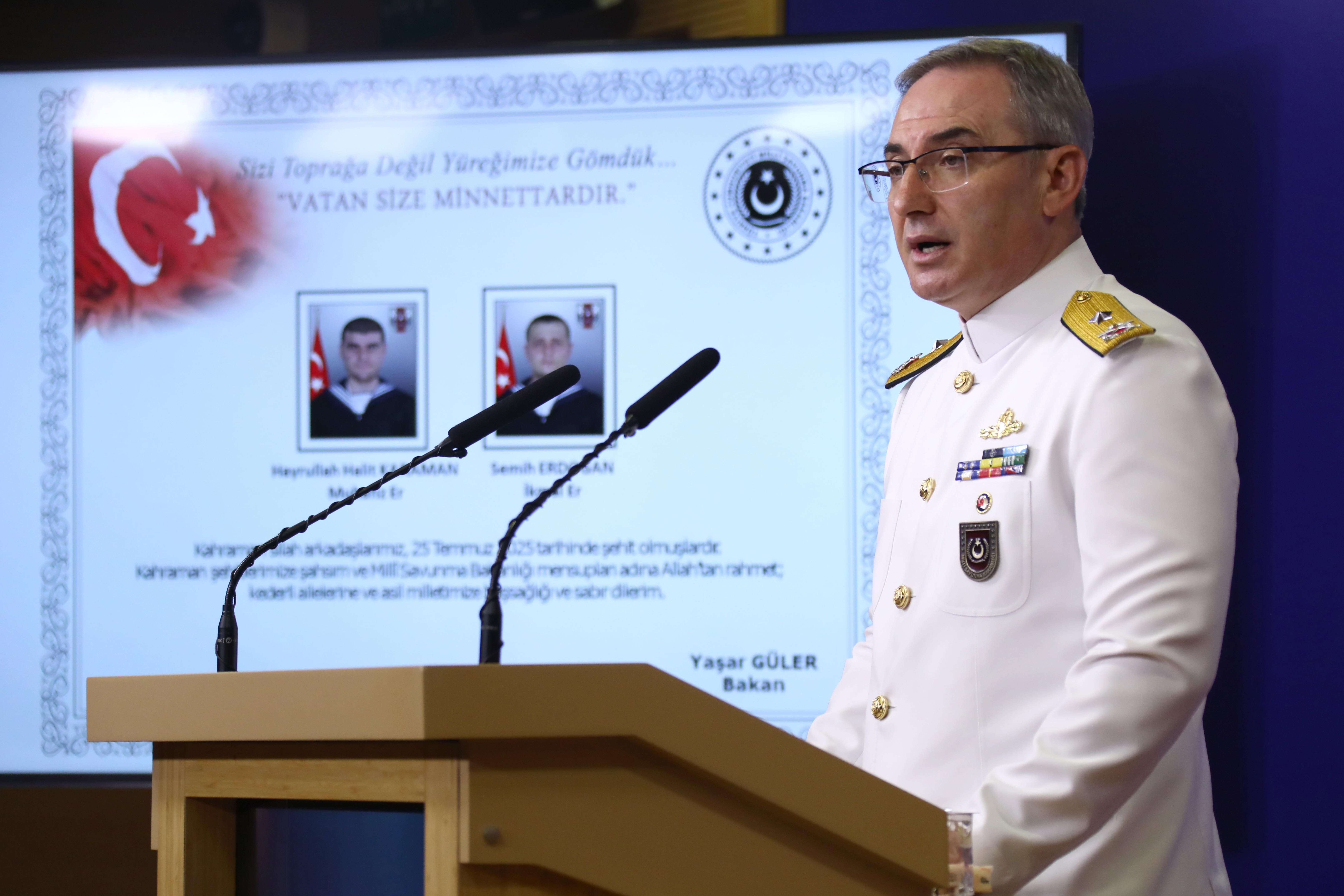 MSB Basın ve Halkla İlişkiler Müşaviri ve Bakanlık Sözcüsü Tuğamiral Zeki Aktürk, son bir haftada yapılan faaliyetlere ilişkin bakanlıkta basın toplantısı düzenledi. Tuğamiral Zeki Aktürk, 23 ve 30 Temmuz'da meydana gelen araç kazaları sonucu şehit olan Hava Savunma Üsteğmen Tuğrul Özsu ve Topçu Uzman Çavuş Servet Ökkeş Çakır ile 25 Temmuz'da İskenderun Deniz Er Eğitim Alay Komutanlığı'nda temel askerlik eğitiminde rahatsızlanarak şehit olan Muhafız Er Hayrullah Halit Kahraman ve İkmal Er Semih Erdoğan'a Allah'tan rahmet diledi.