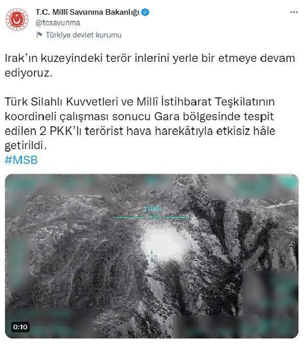 Bakanlığın Twitter hesabından yapılan açıklamada, "Irak'ın kuzeyindeki terör inlerini yerle bir etmeye devam ediyoruz. Türk Silahlı Kuvvetleri ve Milli İstihbarat Teşkilatı'nın koordineli çalışması sonucu Gara bölgesinde tespit edilen 2 PKK'lı terörist hava harekatıyla etkisiz hale getirildi" denildi. (DHA)