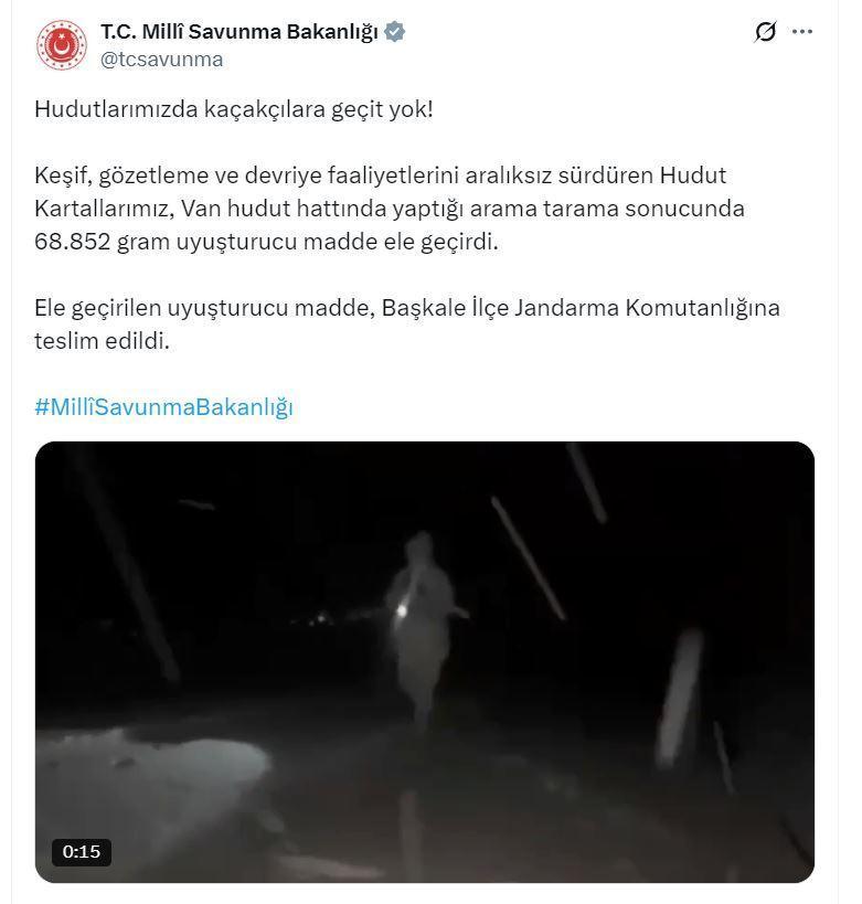 ANKARA, (DHA)- MİLLİ Savunma Bakanlığı (MSB), Van hudut hattında yapılan arama tarama faaliyetlerinde 68 kilo 852 gram uyuşturucu madde ele geçirildiğini duyurdu.