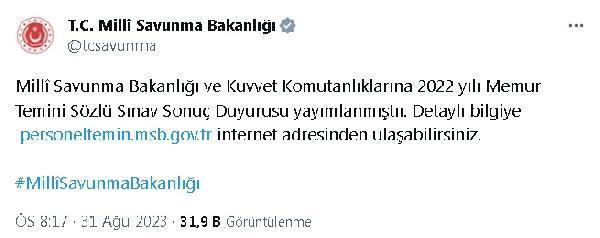 MSB'nin sosyal medya hesabından yapılan paylaşımda, "Milli Savunma Bakanlığı ve Kuvvet Komutanlıklarına 2022 yılı Memur Temini Sözlü Sınav Sonuç Duyurusu yayımlanmıştır. Detaylı bilgiye https://personeltemin.msb.gov.tr internet adresinden ulaşabilirsiniz" denildi. (DHA)