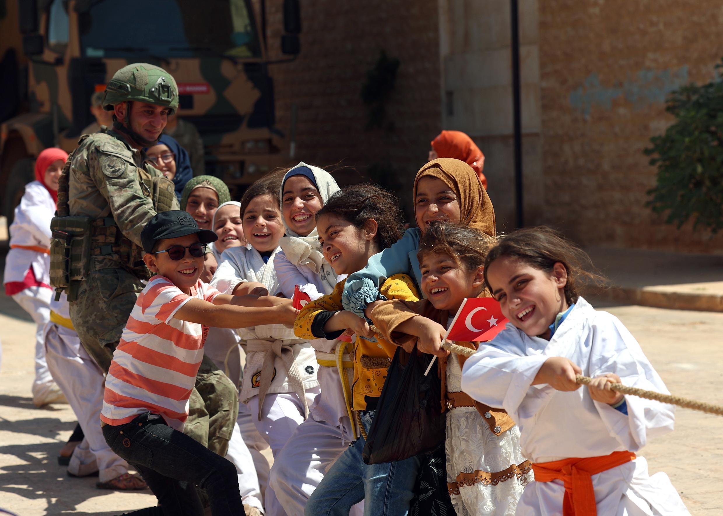 Bakanlığın sanal medya hesabından 'Günün fotoğrafı' etiketi ile paylaşılan fotoğrafta çocuklarla halat çekme oyunu oynayan Mehmetçik yer aldı. Fotoğrafa ilişkin yapılan açıklamada "Güç silahta değildir. Asıl güç, masumların size duyduğu güvendir" denildi. (DHA)