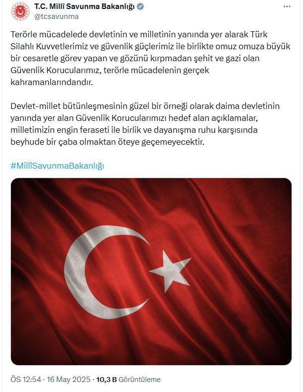 ANKARA, (DHA)- MİLLİ Savunma Bakanlığı'ndan (MSB) yapılan açıklamada, "Güvenlik korucularımızı hedef alan açıklamalar, milletimizin engin feraseti ile birlik ve dayanışma ruhu karşısında beyhude bir çaba olmaktan öteye geçemeyecektir" denildi.