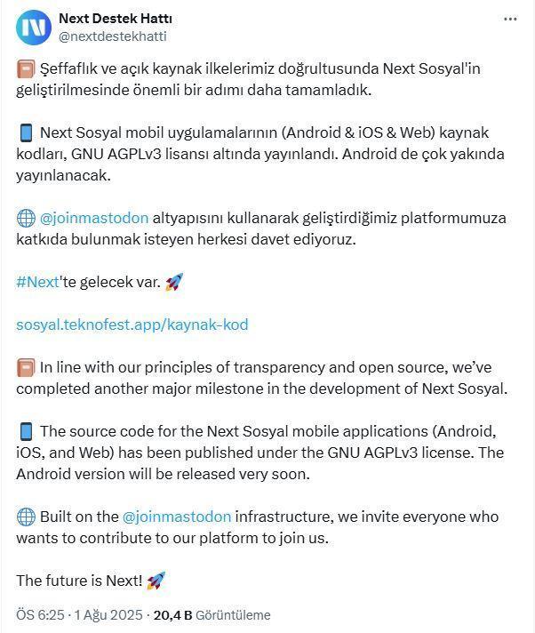 Türkiye Teknoloji Takımı Vakfı (T3 Vakfı) ve BAYKAR ortaklığıyla geliştirilen yerli sosyal medya platformu NEXT Sosyal'den yapılan açıklamada, "Şeffaflık ve açık kaynak ilkelerimiz doğrultusunda Next Sosyal'in geliştirilmesinde önemli bir adımı daha tamamladık. Next Sosyal mobil uygulamalarının (Android & iOS & Web) kaynak kodları, 'GNU AGPLv3' lisansı altında yayınlandı. Android de çok yakında yayınlanacak. Platformumuza katkıda bulunmak isteyen herkesi davet ediyoruz. Next'te gelecek var" ifadelerine yer verildi. (DHA)