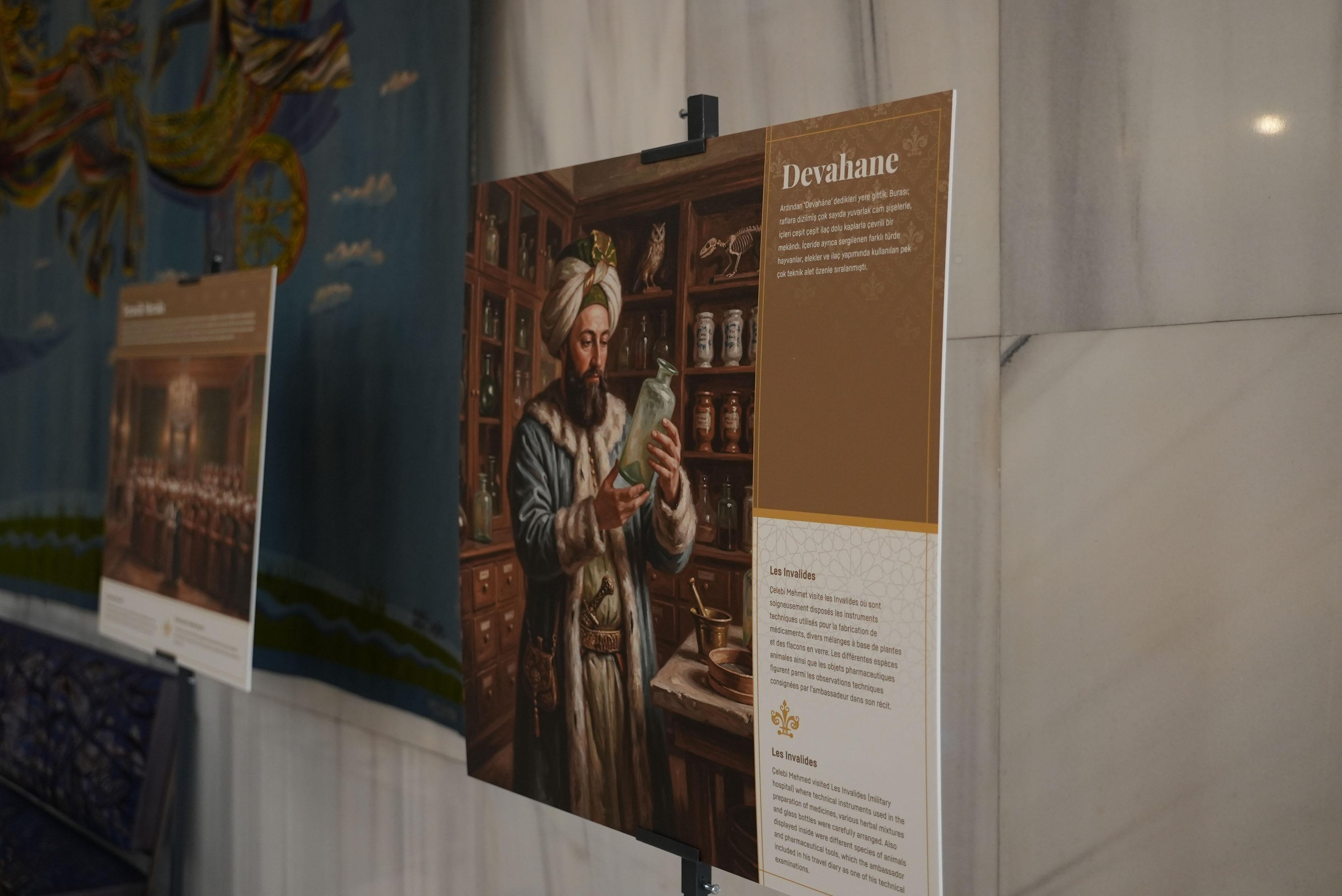 Sergi kapsamında, 1729 yılında III. Ahmed tarafından Fransa’ya büyükelçi olarak atanan Yirmisekiz Çelebi Mehmet Efendi’nin görev sürecine dair kaleme aldığı Fransa Sefâretnâmesi, görsel anlatılarla yeniden canlandırıldı. Sergide Çelebi’nin Fransa’ya yolculuğundan, veba korkusuyla girdiği karantinaya ve katıldığı sosyal etkinliklere kadar birçok detay, yapay zeka destekli modellemelerle görselleştirildi.