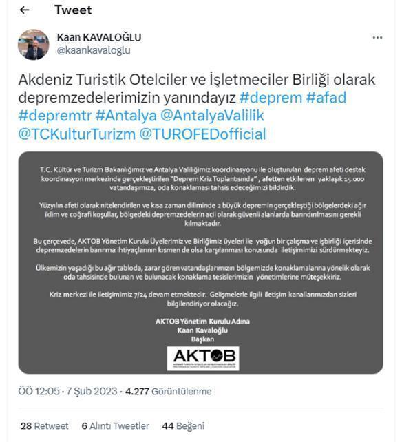 AKTOB Başkanı Kaan Kavaloğlu yaptığı açıklamada, "Kültür ve Turizm Bakanlığı ve Antalya Valiliği koordinasyonuyla oluşturulan deprem afeti destek koordinasyon merkezinde gerçekleştirilen 'Deprem Kriz Toplantısında', afetten etkilenen yaklaşık 15 bin vatandaşımıza, oda konaklaması tahsis edeceğimizi bildirdik. Yüzyılın afeti olarak nitelendirilen ve kısa zaman diliminde 2 büyük depremin gerçekleştiği bölgelerdeki ağır iklim ve coğrafi koşullar, bölgedeki depremzedelerin acil olarak güvenli alanlarda barındırılmasını gerekli kılmaktadır" dedi.